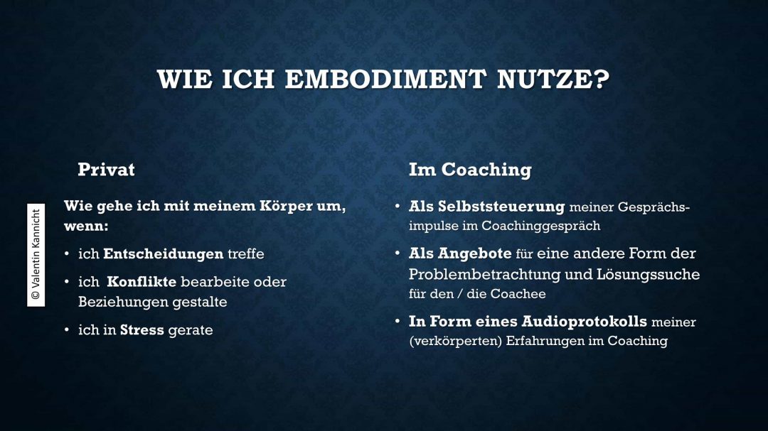 Im Coaching nutzt Valentin Embodiment gezielt, um Klient:innen aus vertrauten Denk- und Erzählmustern herauszuführen. Eine einfache, aber wirkungsvolle Intervention besteht darin, bei belastenden Themen nach der körperlichen Wahrnehmung zu fragen, etwa: